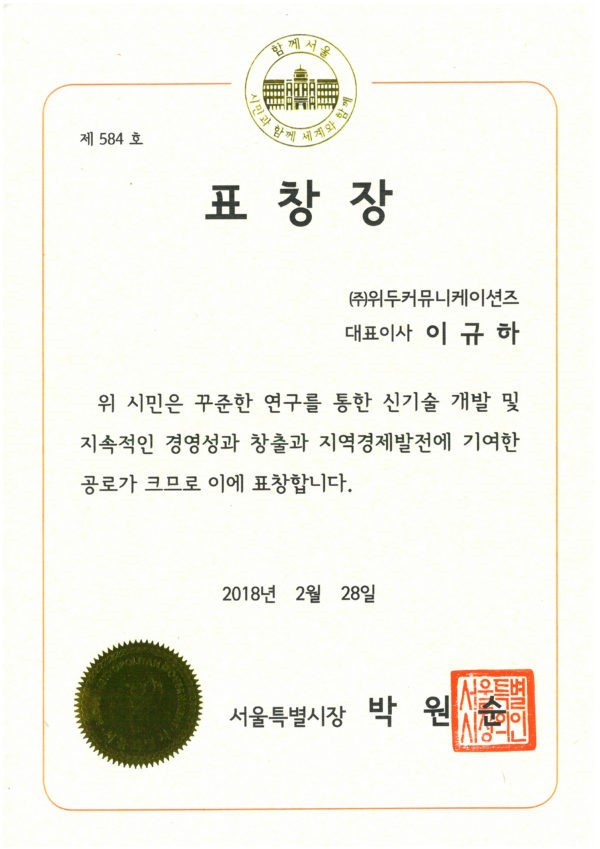 서울특별시장 표창장 페이지 정보 작성자 WeDu 댓글 0건 조회 6,781회 작성일 19-05-30 19:35 본문 2018-02-28 표창장 제 584호 신기술 개발 및 지속적인 경영성 창출, 지역 경제 발전 기여 서울특별시장 박원순 List Previous2018 소년한국 우수 어린이 도서 19.05.30 Next서울클러스터 어워드 우수상 19.05.30