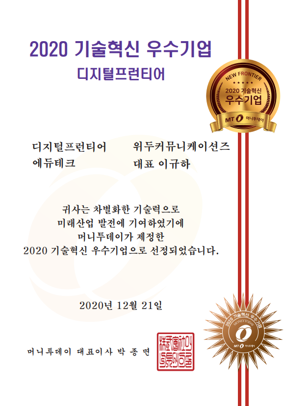 2020 기술혁신 우수기업 페이지 정보 작성자 WeDu 댓글 0건 조회 6,229회 작성일 21-12-31 12:58 본문 2020-12-21 2020 기술혁신 우수기업 디지털프런티어 에듀테크 머니투데이 대표이사 List Previous2020 소년한국 우수 어린이 도서 선정 21.12.31 Next2020 서울산업진흥원 2020 DMC어워드 21.12.31
