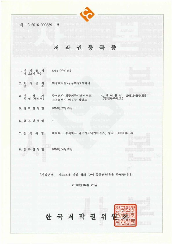 [한국/저작권] 아리스 페이지 정보 작성자 WeDu 댓글 0건 조회 6,317회 작성일 19-05-30 19:09 본문 2016-04-22 저작권 C-2016-009839 아리스 / 미술저작물>응용미술>캐릭터 List Previous[한국/저작권] 필립 19.05.30 Next[한국/저작권] 리안 19.05.30